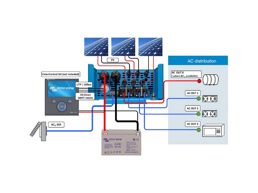 Kromě kvalitního výkonného měniče napětí s čistou sinusovkou kombinuje funkce adaptivního nabíjení, hybridní technologie PowerAssist, ultrarychlého přepínače zdroje napájení - UPS, solárního regulátoru Blue Solar MPPT a dalších technologií pro možnost vytvoření sofistikovaného hybridního solárního systému na míru.