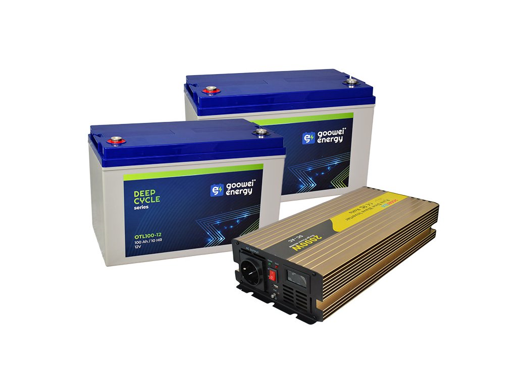 Tento set obsahuje: 2xTrakční (GEL) baterie GOOWEI ENERGY (100Ah, 12V) + Sinusový měnič napětí ROGERELE (2000W, 24V).