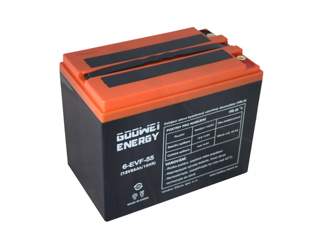 Gelové akumulátory značky GOOWEI ENERGY řady EVF - DEEP CYCLE vznikají pod privátní značkou naší společnosti. Na základě dlouholetých zkušeností v oblasti akumulátorů jsme ve spolupráci s výrobcem kladli důraz na vysokou jakostní kvalitu použitých materiálů (čistotu olova), dlouhou cyklickou životnost (extra silné mřížky článků) a maximální spolehlivost a bezpečnost akumulátorů v provozu. Jedná se o uzavřené olověné akumulátory v provedení VRLA. Technologie hybridní GEL = elektrolyt je ztužen v hybridním gelu (kombinace s AGM), a tím je pevně vázán v útrobách článků baterie, čímž je vyloučen jeho únik. Extra silná mřížka článků zajišťuje velmi vysokou cyklickou odolnost (okolo 600 cyklů při 80% D.O.D = hloubka vybití 80%), což tyto akumulátory předurčuje pro aplikace, kde dochází k častému a hlubokému vybíjení / cyklování, tedy hlavně pro pohony elektromotorů. Díky dlouhodobému kontraktu a přímému dovozu ze zakázkové výroby dokážeme tyto kvalitní akumulátory nabízet za velmi příznivé ceny! Výborný poměr cena / kvalita / výkon řadí trakční baterie GOOWEI ENERGY k nejprodávanějším na trhu.