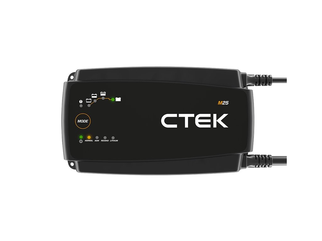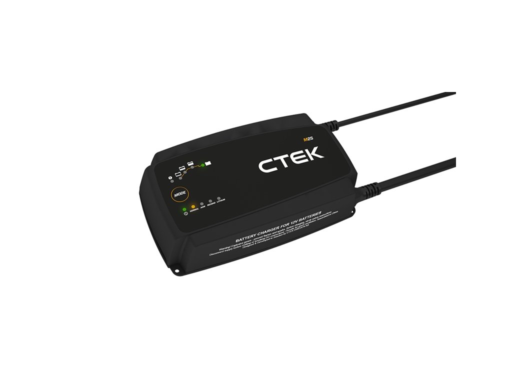 CTEK M25 je nová verze nabíječky M300, která nabízí spoustu vylepšení. Jde o plně automatickou osmikrokovou nabíječku, řízenou mikroprocesorem. Nabíjecí proud je 25 A. Je určena pro 12 V baterie od 40 do 500 Ah. Ideální pro použití na lodích a v karavanech. Je vhodná pro nabíjení a udržování zejména olověných trakčních baterií všech druhů včetně AGM, GELových a Lithiových baterií. 4m dlouhý připojovací kabel je navíc zakončen i teplotním čidlem, díky němuž dokáže CTEK M25 efektivně regulovat parametry nabíjení. K další výbavě patří režimy „RECOND“ pro regenerování hluboce vybitých akumulátorů. M25 může zůstat libovolně dlouho připojen, přičemž baterie udržuje v nejlepší možné kondici. Stačí tlačítkem zvolit požadovaný režim.