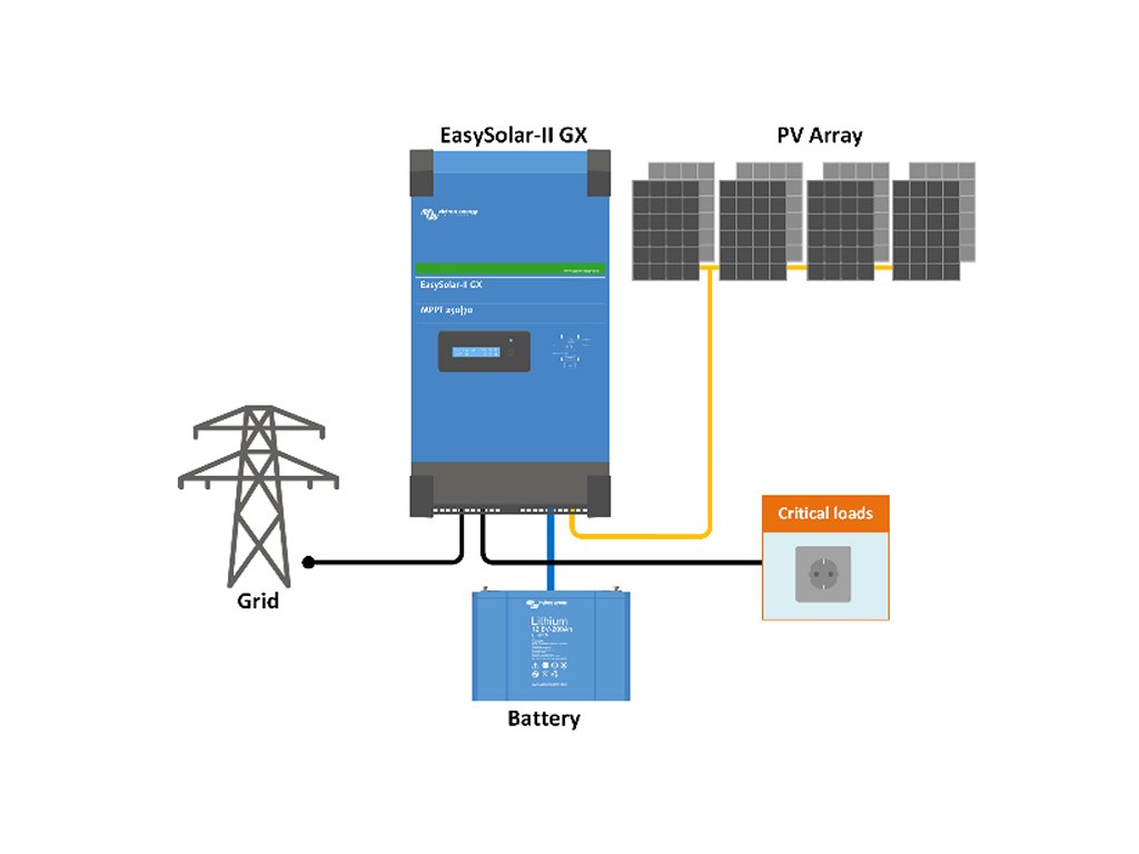 Zařízení EasySolar II. zahrnuje v jednom kompaktním zařízení: měnič, nabíječku, solární MPPT regulátor a zařízení GX s displejem.