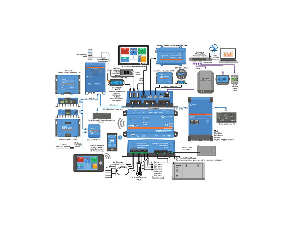 Pro komunikaci a monitoring je možné využít GX zařízení (například Victron Cerbo GX) se spojením přes vestavěné komunikační rozhraní VE.Can. Podrobnější konfigurace a následné aktualizace firmwaru jsou možné jak přes vestavěné komunikační rozhraní VE.Can, tak pomocí kabelu USB (VE.Direct USB).