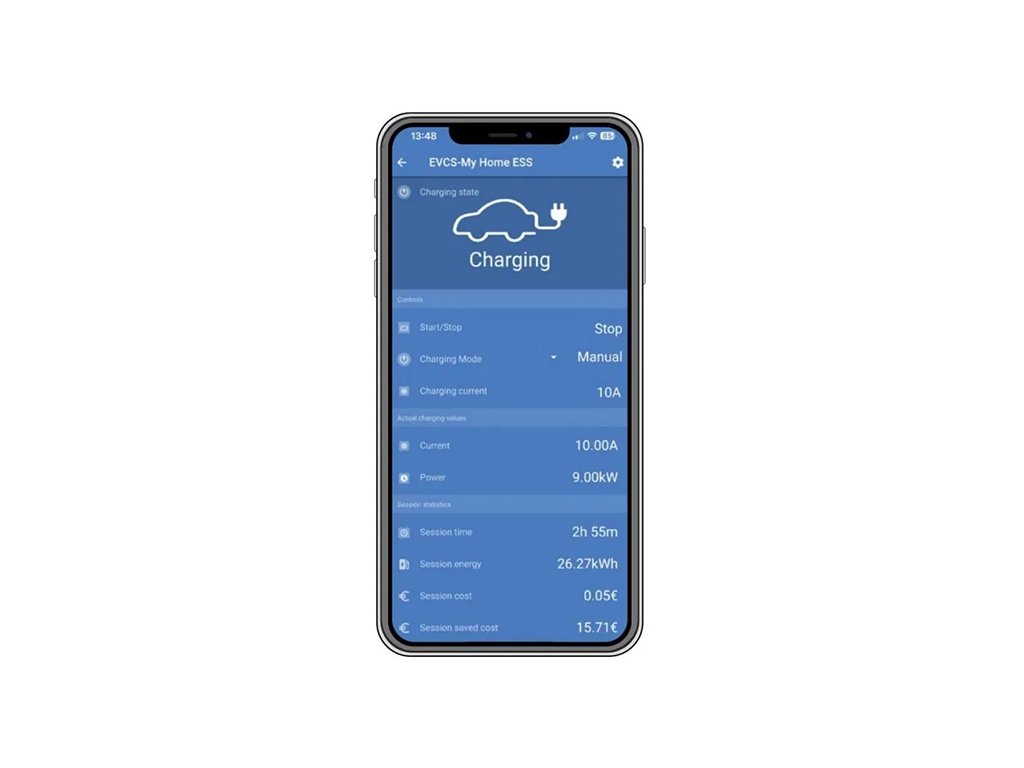 - Manuální režim umožňuje konfigurovat výstupní proud v rozmezí 6-32 A. Nabíjecí výkon je řízen dvěma způsoby: pomocí posuvníku na dotykovém LCD displeji nebo pomocí jeho webové stránky. Umožňuje ručně spustit nebo zastavit nabíjení, když je vozidlo připojeno k nabíjecí stanici.
