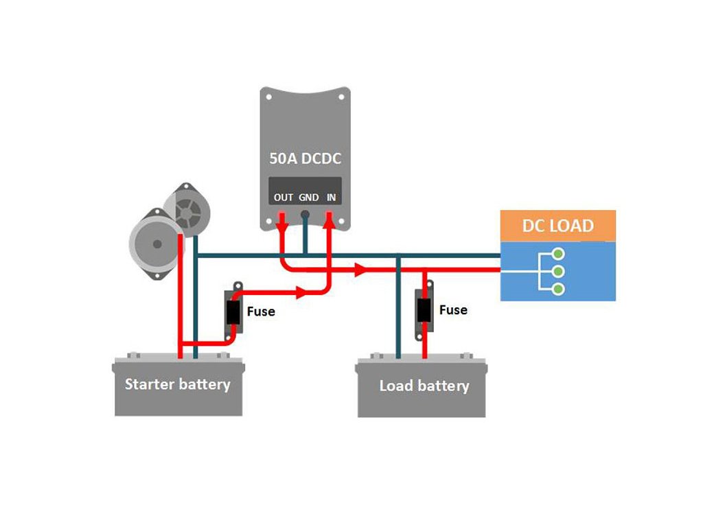 Tento konvertor umí nabíjet 12V nebo 24V baterii z 12V nebo 24V alternátoru/generátoru či baterie