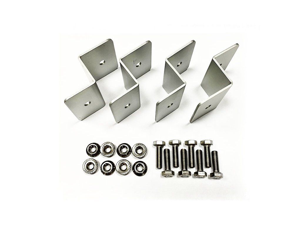 Sada obsahuje 4ks hliníkových držáků + sada 8 šroubů pro uchycení hliníkovému rámu solárního panelu k podkladu (solární panely mají obvykle předvrtané otvory již z výroby).