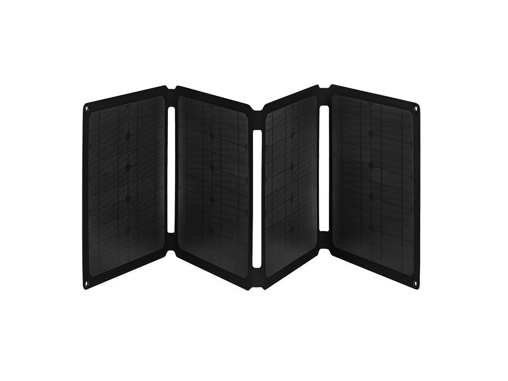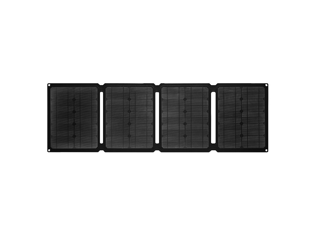 Přenosný skládací solární panel monokrystalický, porty USB-A (15W), USB-A (QC3.0-18W) a USB-C (60W) pro nabíjení chytrých telefonů, tabletů powerbanky, port DC5521 pro připojení notebooku anebo jiné elektroniky. Součástí 4 karabiny pro upevnění.