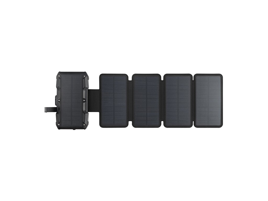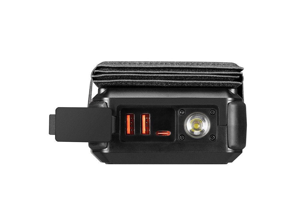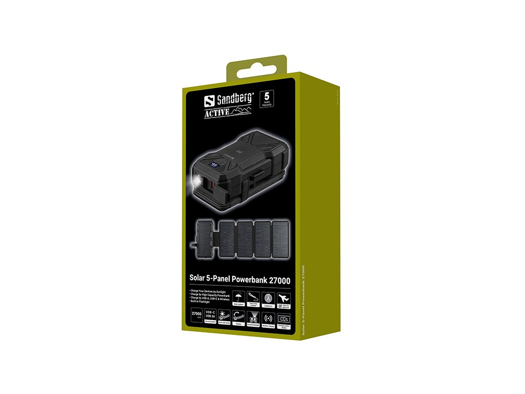Sandberg solární powerbanka 5-panelů 421-06 27000mAh 99.9Wh je outdoorová, přenosná, kvalitní a kompaktní. Je kombinací výkonné powerbanky o kapacitě 27000mAh a 5 solárních panelů o výkonu 8W. Powerbanku je možné dobít ze sluneční energie. Možnost bezdrátového nabíjení anebo nabíjení pomocí protokolu PPS. Po složení má kompaktní rozměry pouze 17,2 x 9,8 x 6,3 cm a hmotnost pouhých 900 gramů. Díky tomu zabere v cestovním zavazadle málo místa. O stavu nabití baterie informuje LCD display. Součástí je LED světlo se 3 variantami osvětlení. Powerbanka je odolná proti prachu a vlhkosti, chráněna krytím IP54.