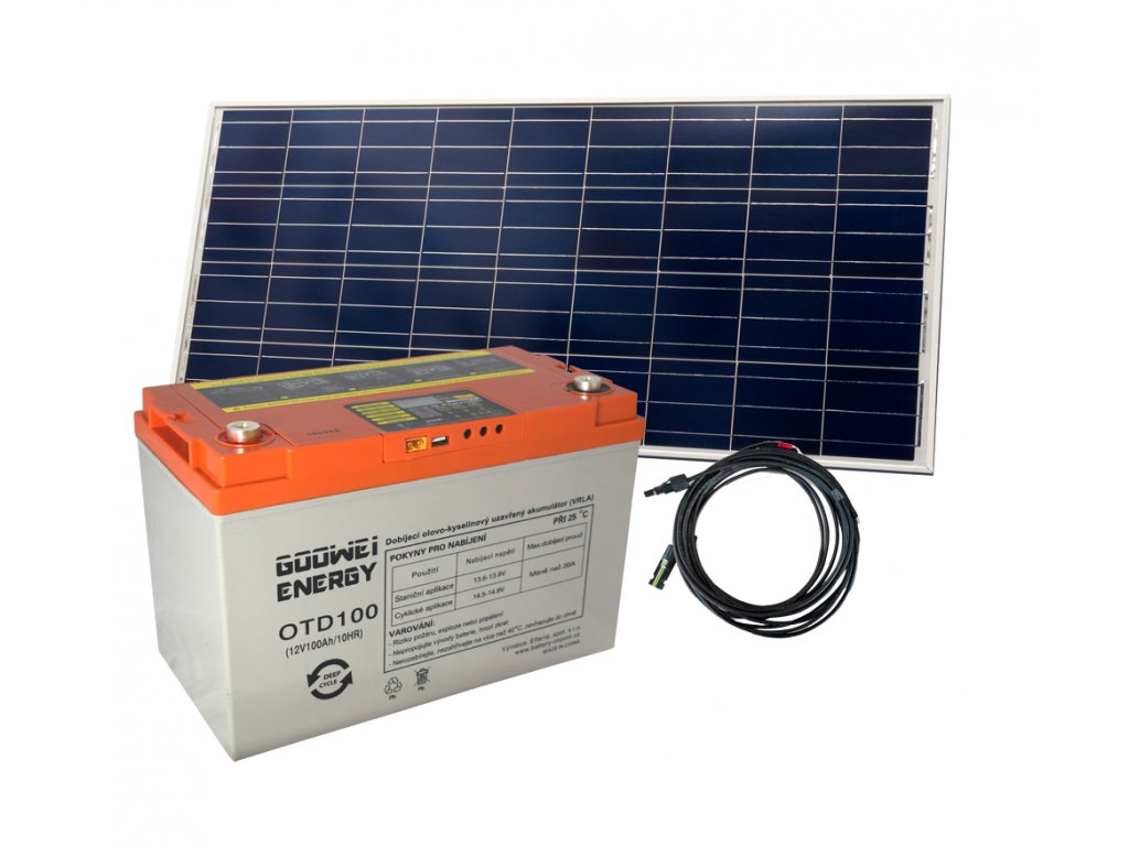 Sada se skládá z trakční baterie GOOWEI ENERGY OTD, solárního panelu Victron Energy a kabelu s konektory (5m) sloužícího k propojení panelu a baterie.