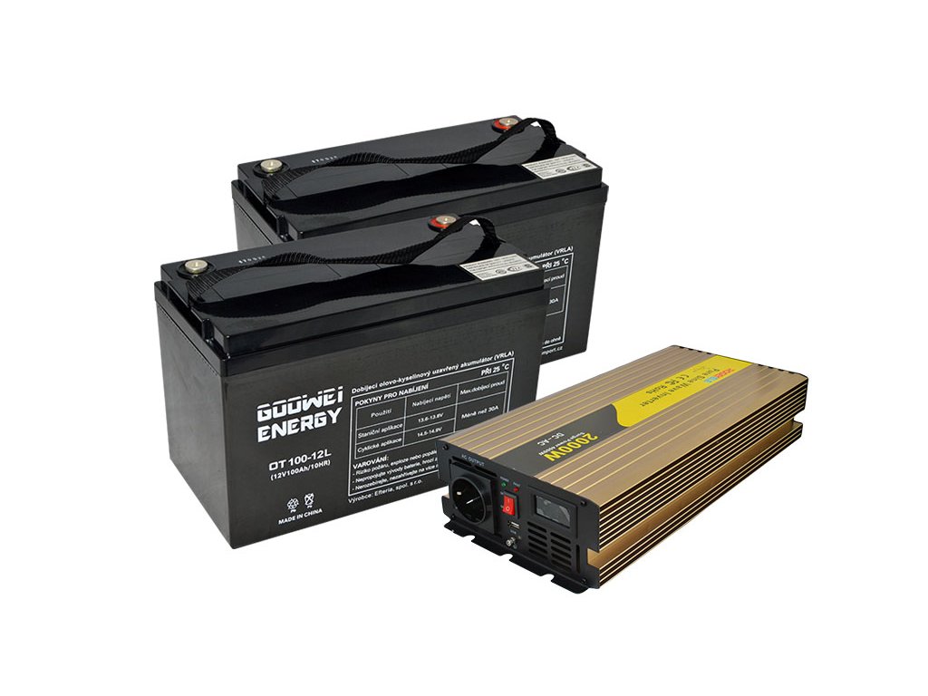 Tento set obsahuje: 2xTrakční (GEL) baterie GOOWEI ENERGY (100Ah, 12V) + Sinusový měnič napětí ROGERELE (2000W, 24V).