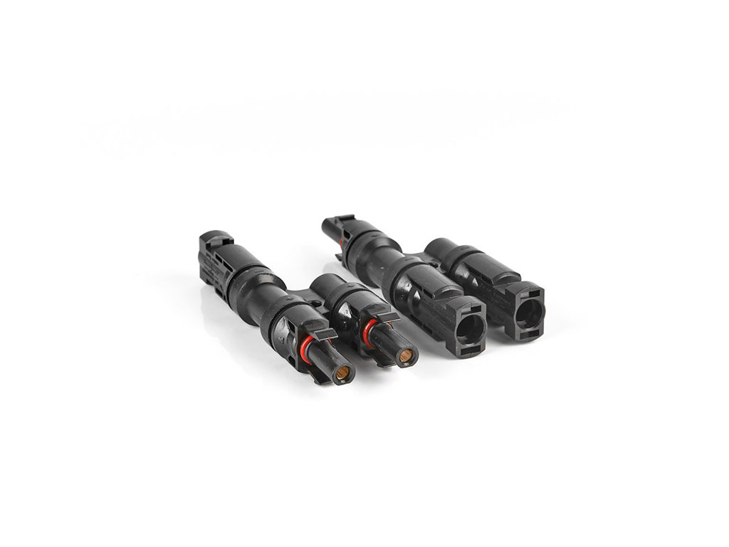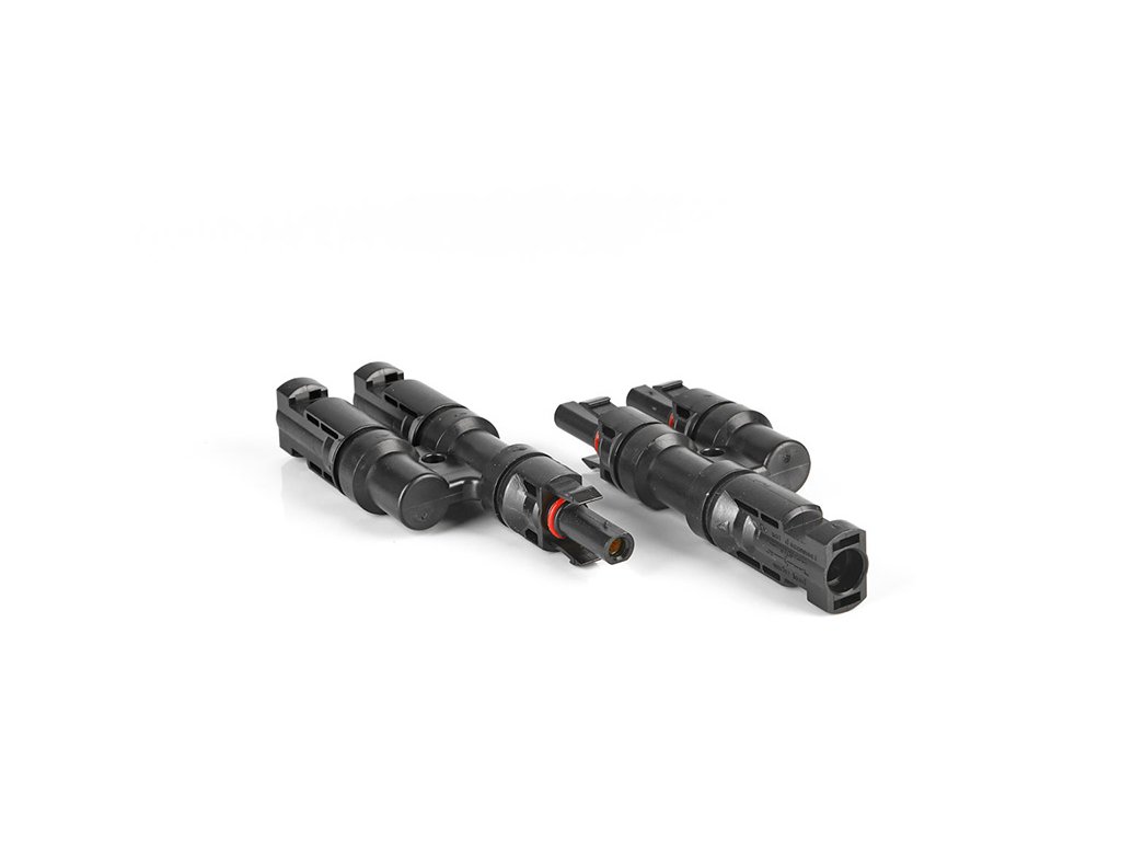 Rozbočovací solární T konektor typu MC4 určený pro paralelní propojení solárních panelů. Je vyroben z vysoce odolného plastu a je opatřen gumovými těsnícími vložkami. Vhodný i pro venkovní aplikace.