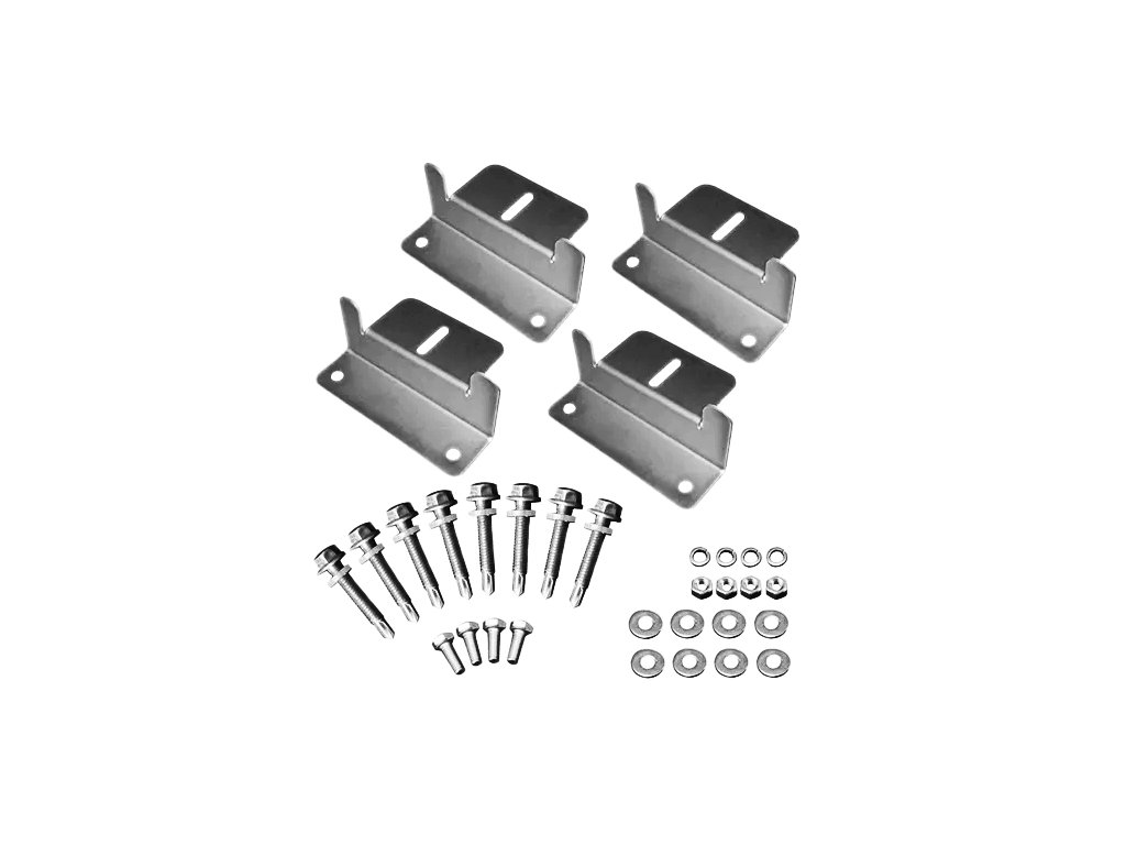 Sada obsahuje: 4 kusy hliníkových držáků + 8ks samořezných šroubů vč. 8 podložek + 4ks šroubů s matkou vč. 4 podložek