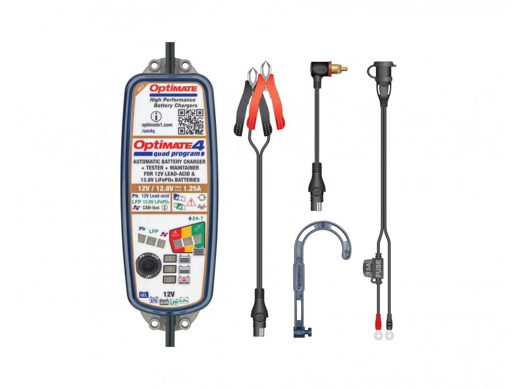 Automatická nabíječka OptiMATE 4 Quad Program Premium 12V/12.8V, 1.25A slouží pro nabíjení olověných bezúdržbových, gelových, AGM, Super MF, VRLA i záložních akumulátorů o kapacitě 4 až 60Ah a lithiových baterií (LiFePO4) s kapacitou 2 až 15Ah.
